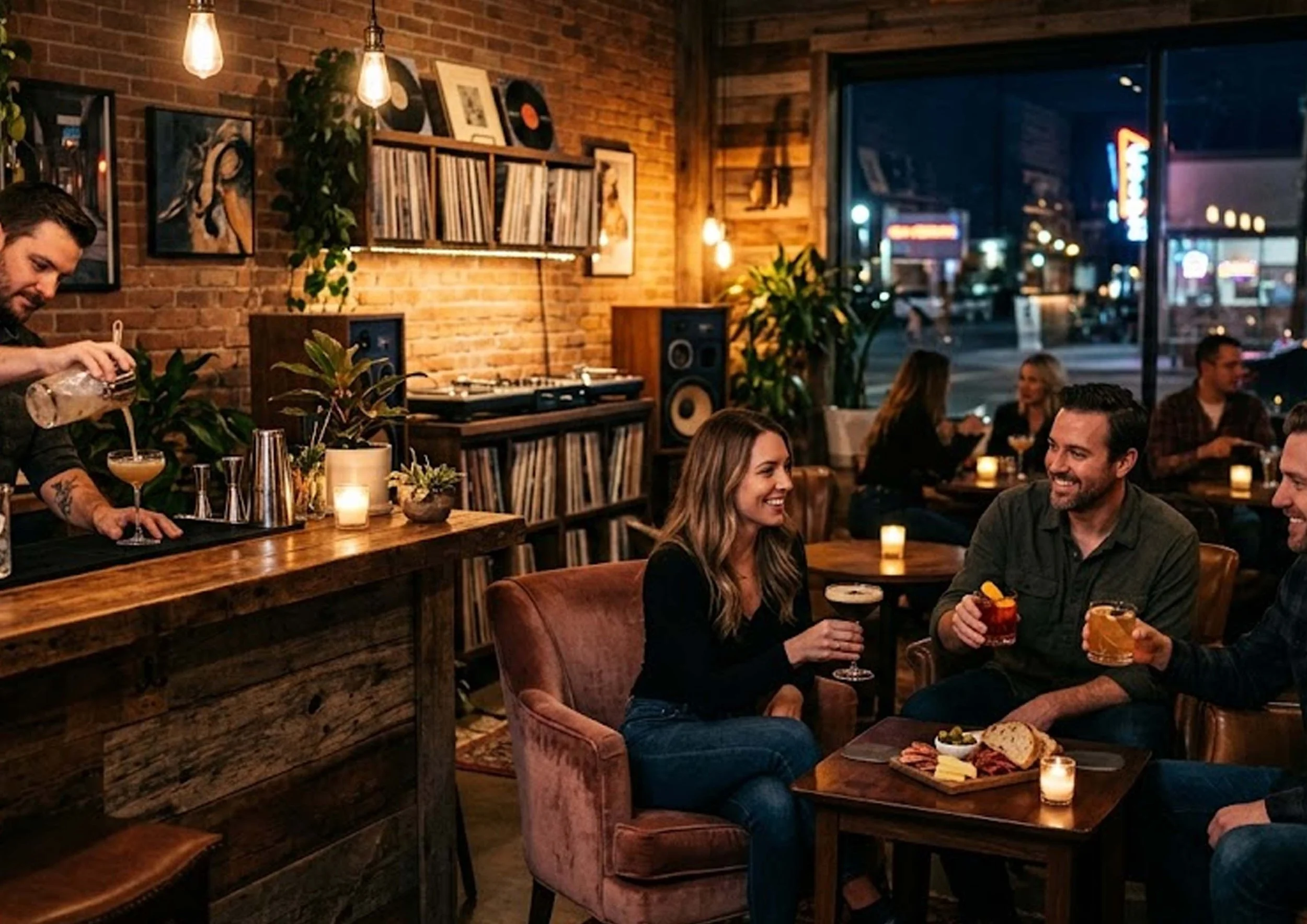 Arrive in the Arts District just after sunset and watch the neighborhood shift from gallery strolls to nighttime energy. Step inside Echo Taste & Sound and settle into the glow of warm lighting, vinyl spinning through the Hi-Fi system, and cocktails crafted with care.