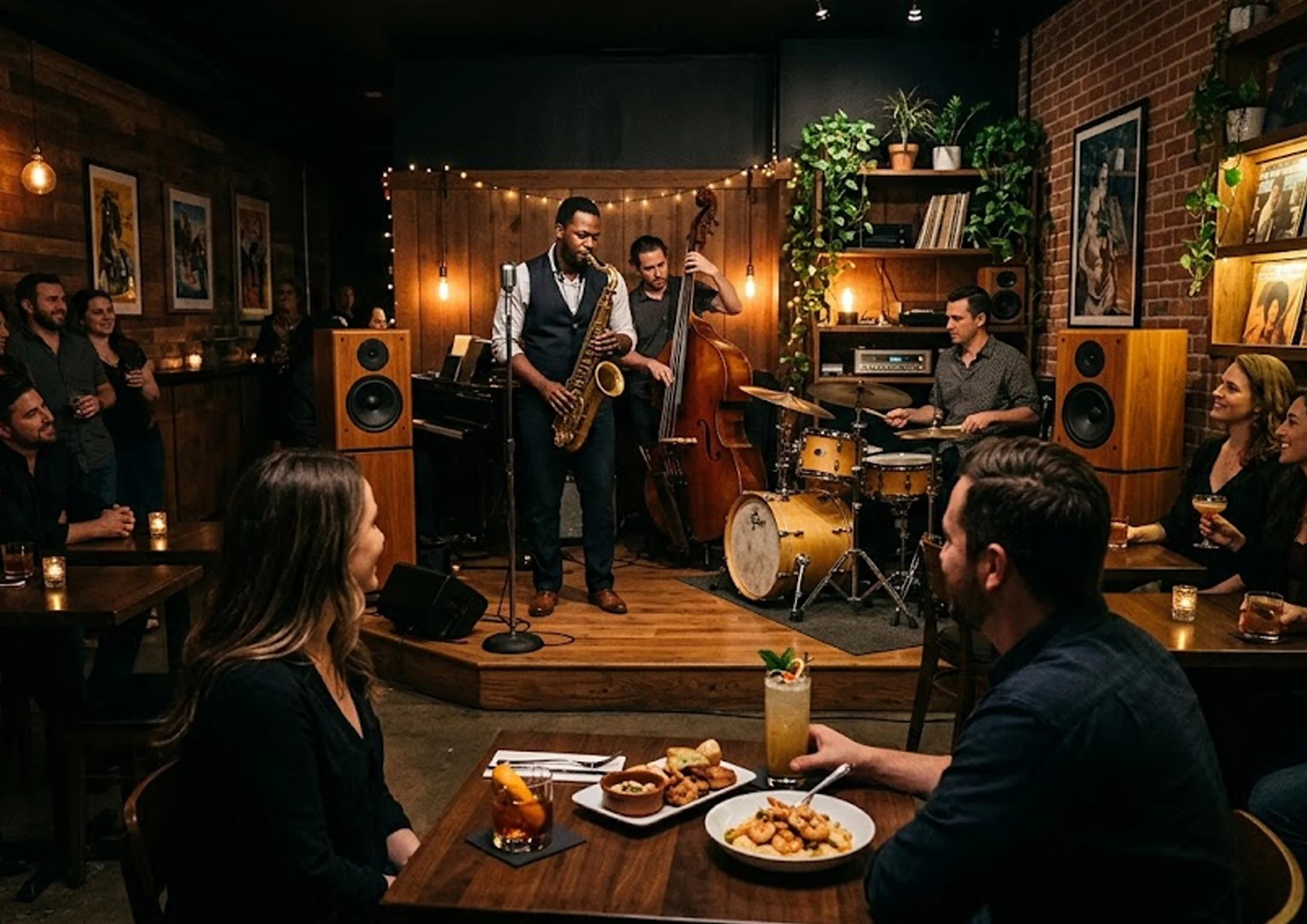 You might begin with a classic cocktail and small plates as vinyl jazz sets the tone. As live musicians take the stage, the energy shifts into focused appreciation. Guests listen, connect, and immerse themselves in the sound. Between performances, many explore the art displays or browse the vinyl selection, making the evening interactive and memorable.