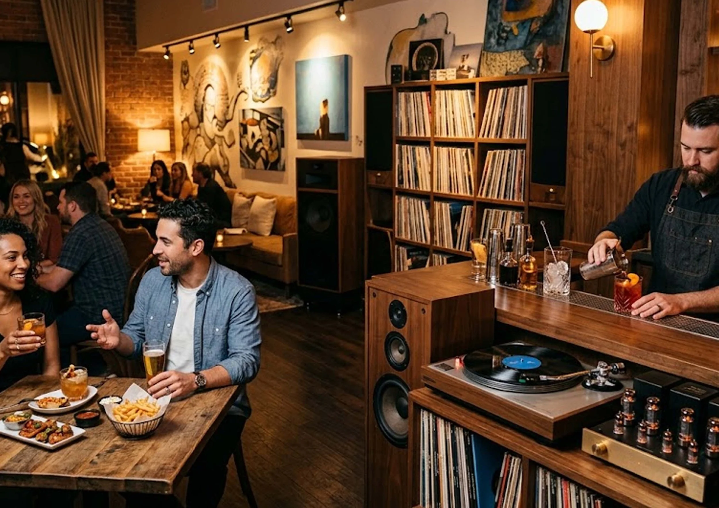 Echo Taste & Sound operates as a true vinyl listening lounge, meaning the music is part of the design — not just background noise.