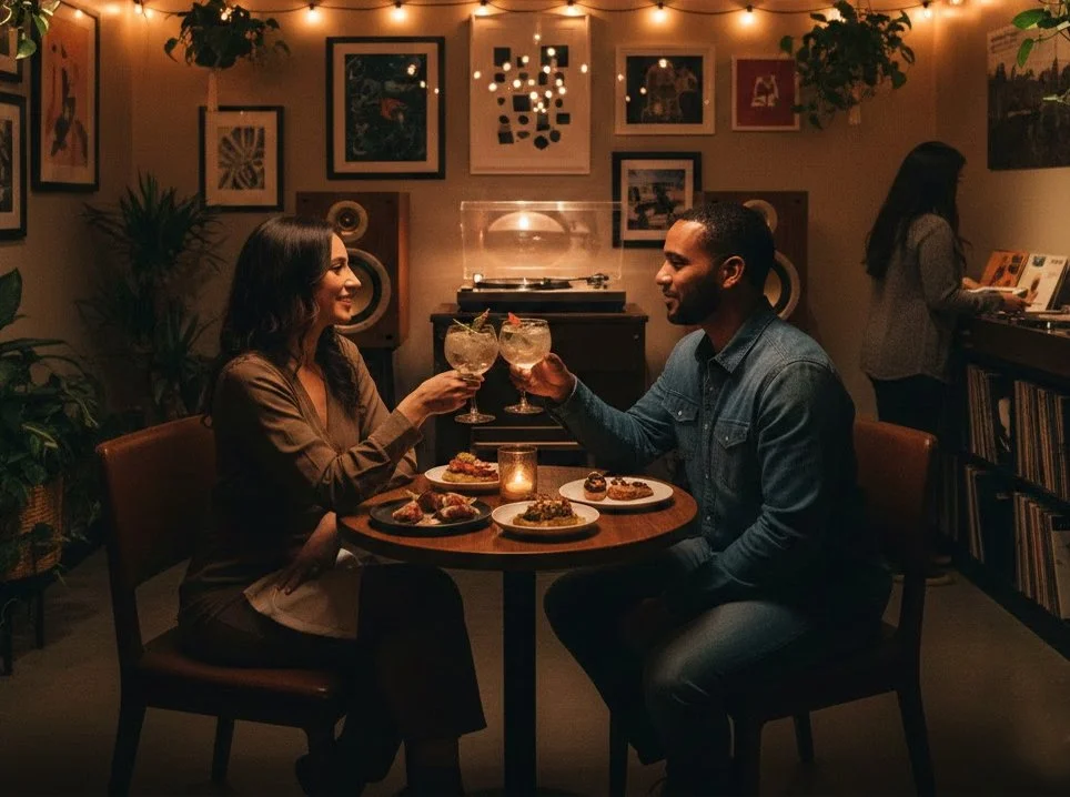 Unlike crowded bars where you have to shout across the table to be heard, our space is designed for acoustic excellence. As a dedicated vinyl listening lounge, the warm, analog richness of curated records fills the room, creating an immersive but comfortable soundscape. You can actually listen to the nuances of rare jazz, soul, and indie cuts while still enjoying a quiet, intimate conversation with your date.