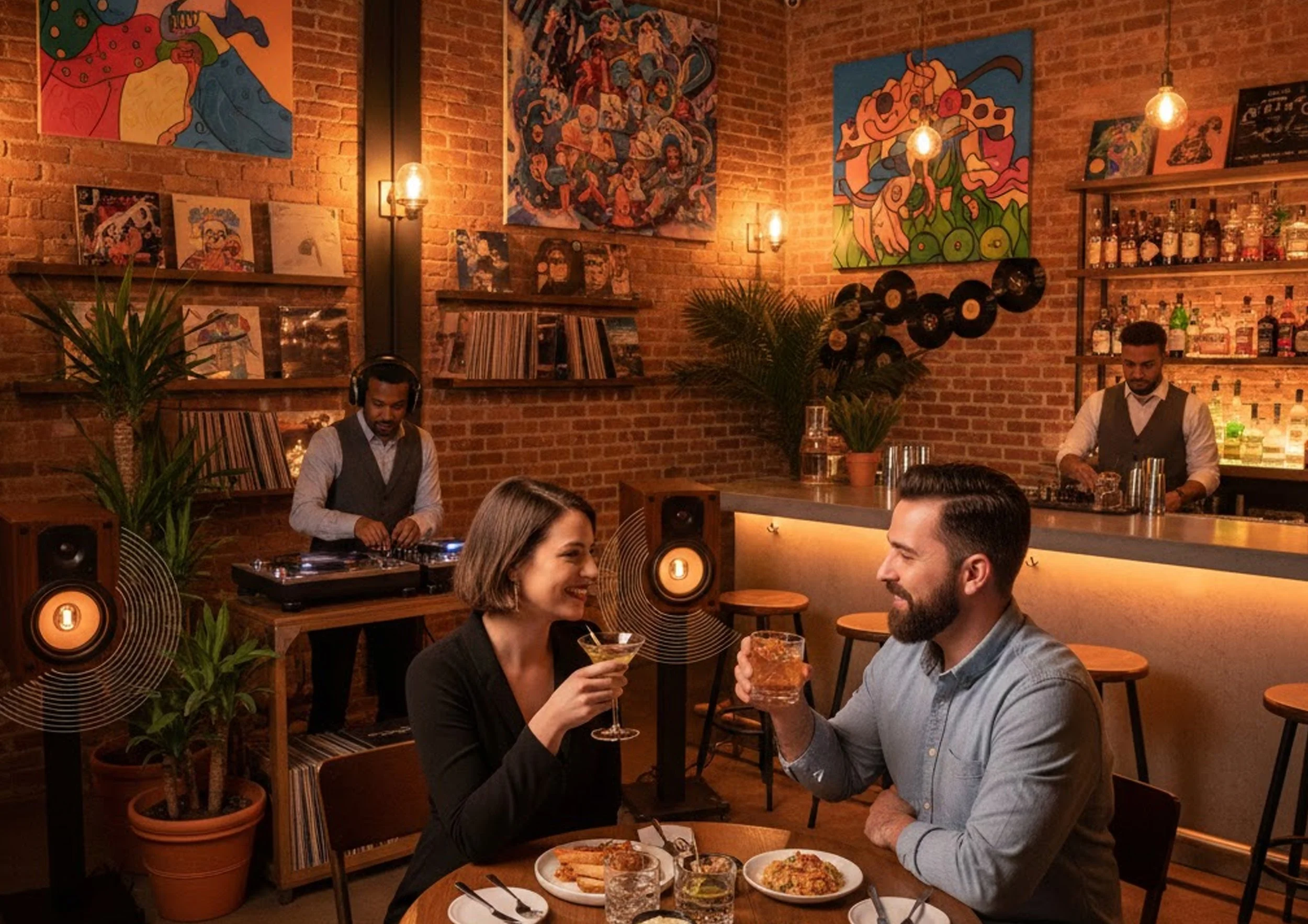 You step into a warm, art-forward interior layered with vinyl sound.