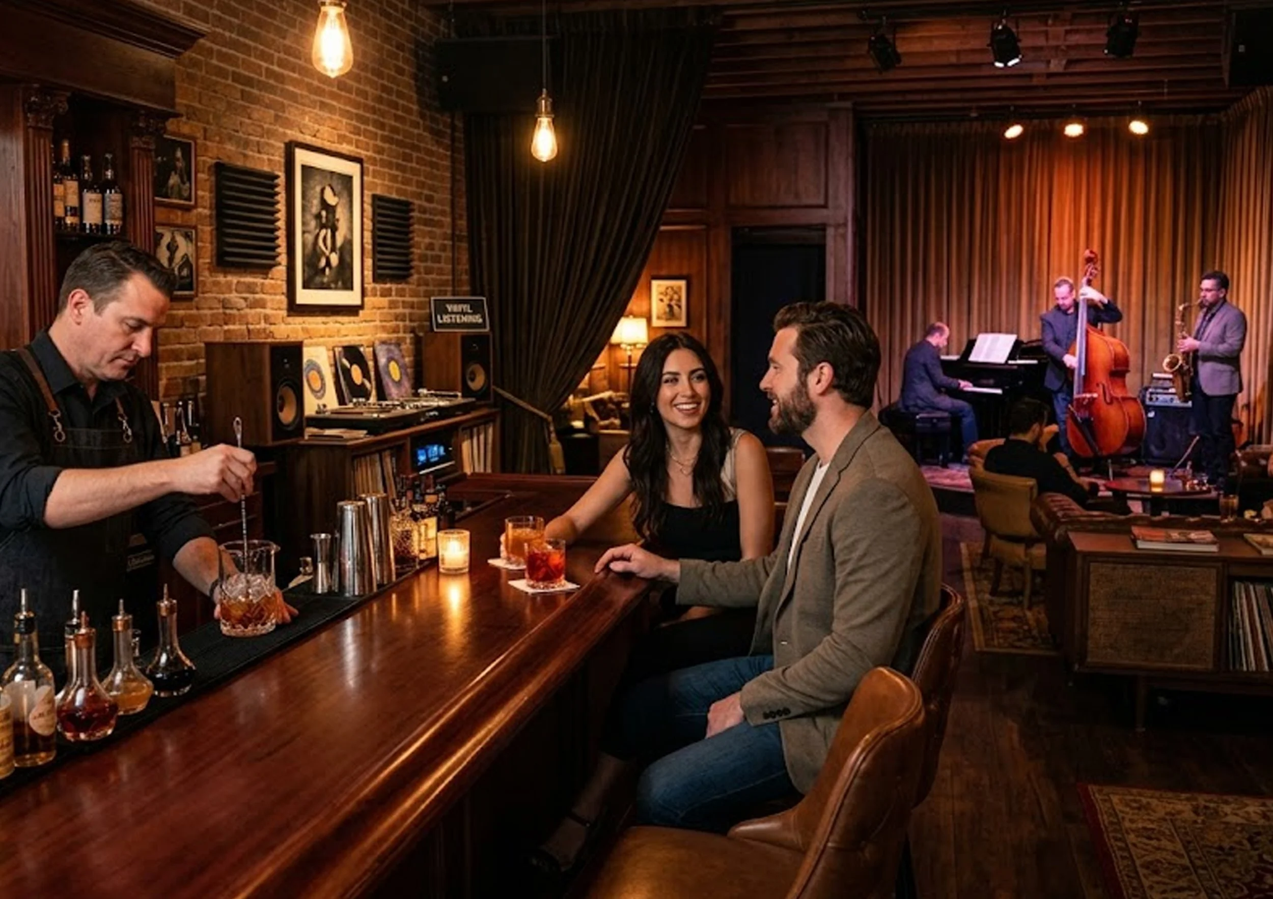 At Echo Taste & Sound, you can slip into a comfortable seat, order a perfectly balanced Old Fashioned, and let vinyl or live jazz shape the mood of the evening.