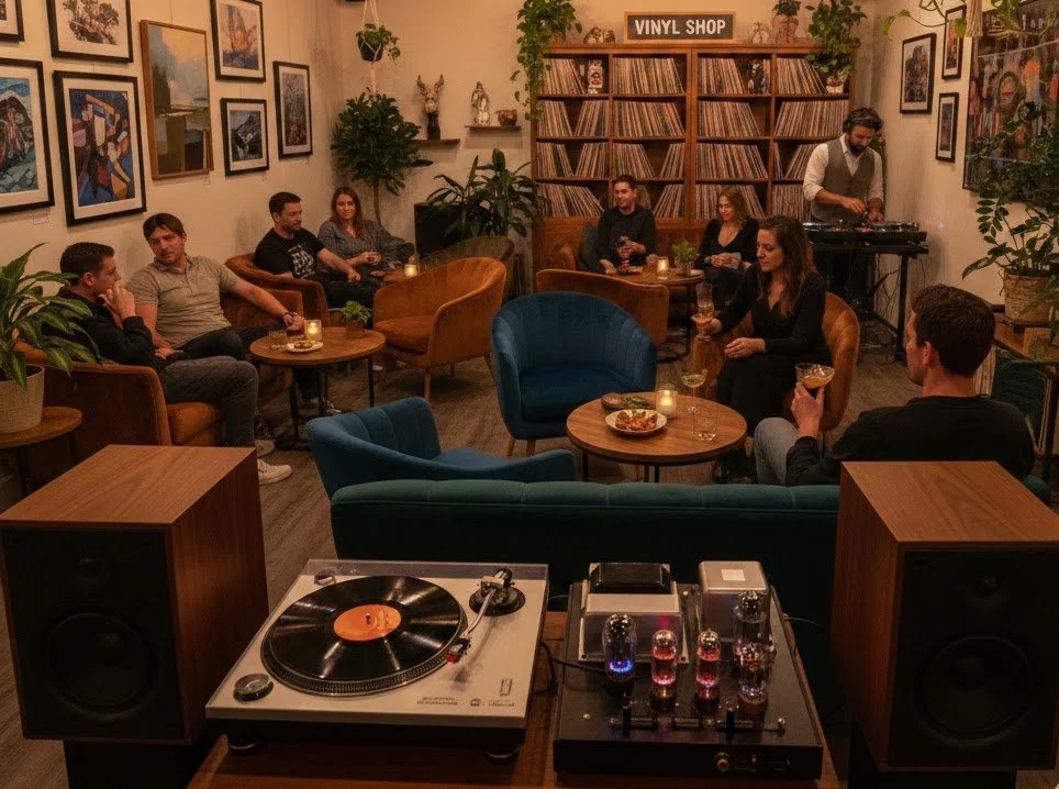 We use premium, high-fidelity audio equipment and acoustically treated design to create a room where music sounds incredibly warm and clear. It’s a space built for active listening and appreciation of vinyl culture.