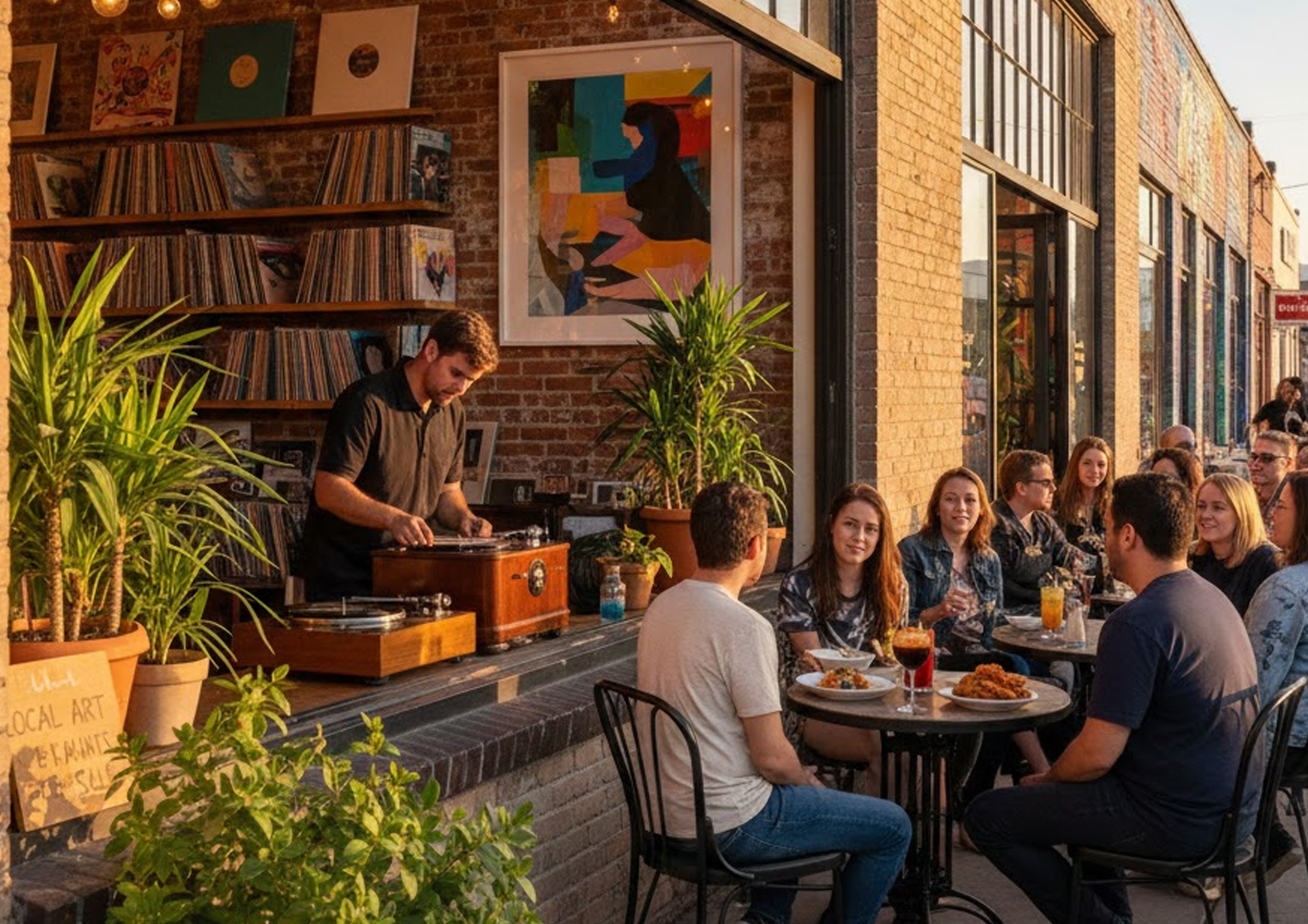 Here, brunch, cocktails, vinyl culture, and local art come together in one intentional, immersive space.