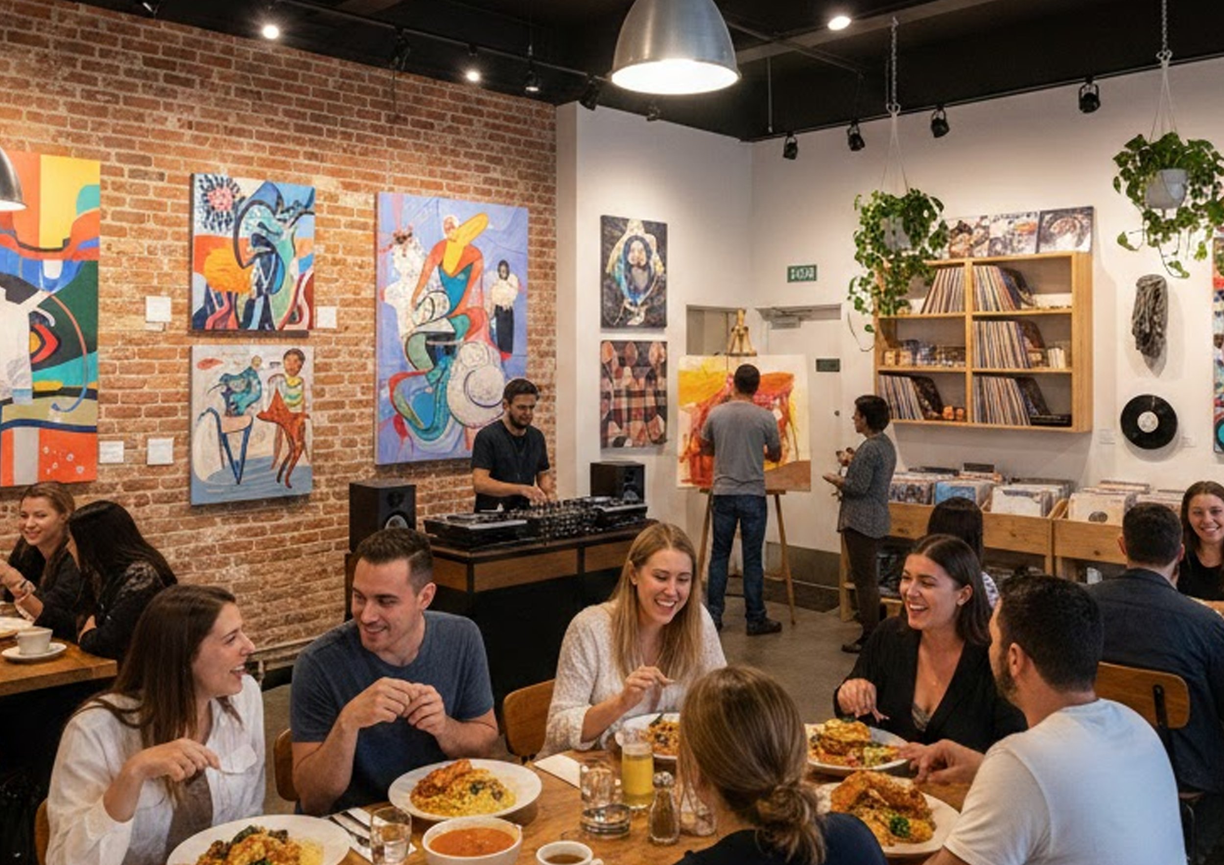 The Arts District isn’t simply a collection of galleries — it’s a walkable, creative corridor where restaurants actively support local talent. Here, you’ll find: