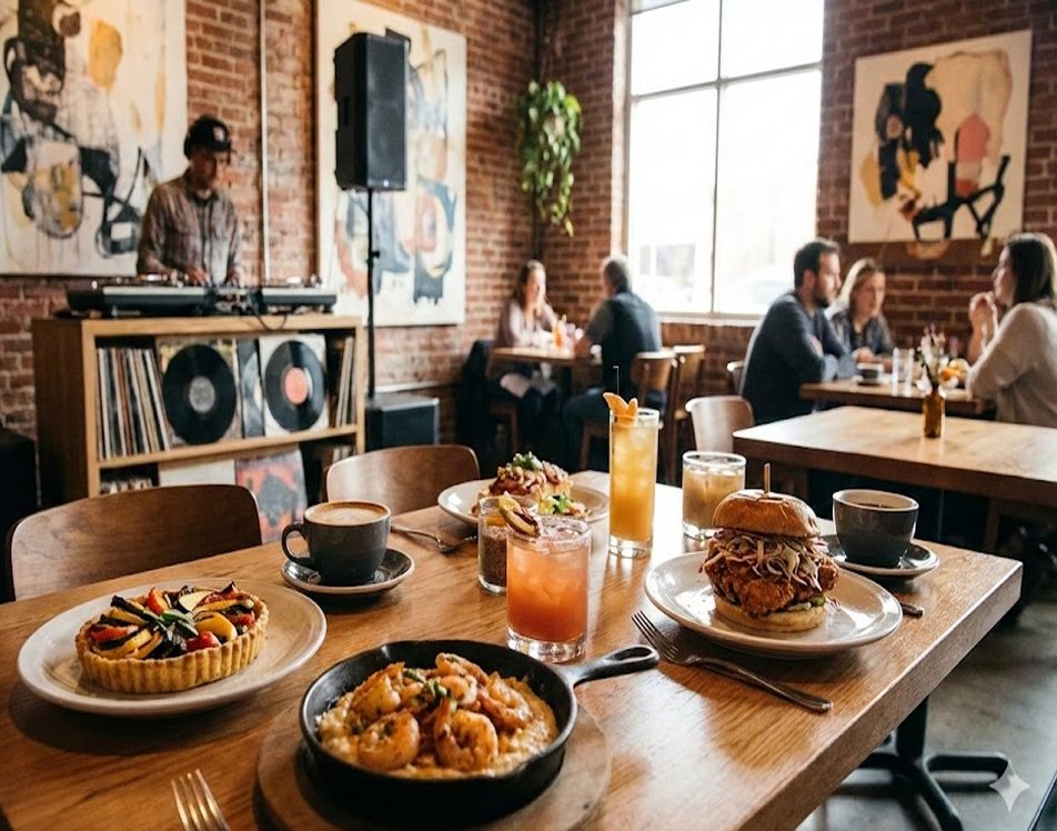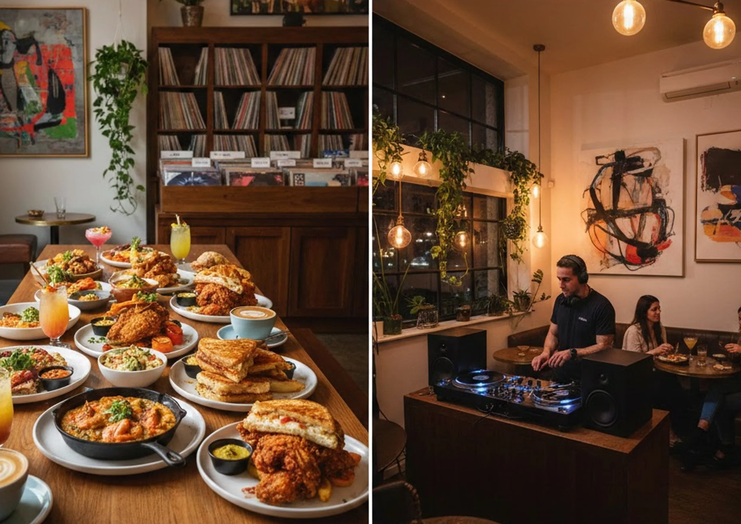 The warm, art-lined space and vinyl soundtrack make brunch feel like an experience — not just a meal.
