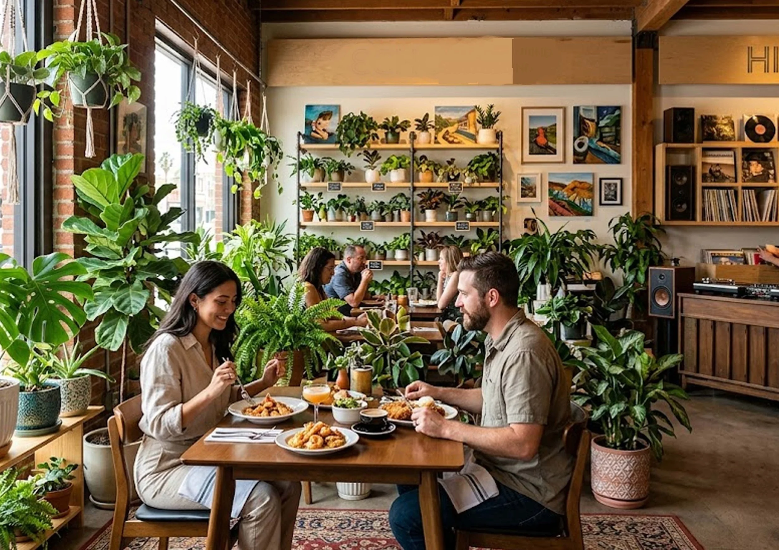The atmosphere is warm and welcoming—sunlight filtering through plants, vinyl playing softly, and local art displayed throughout.