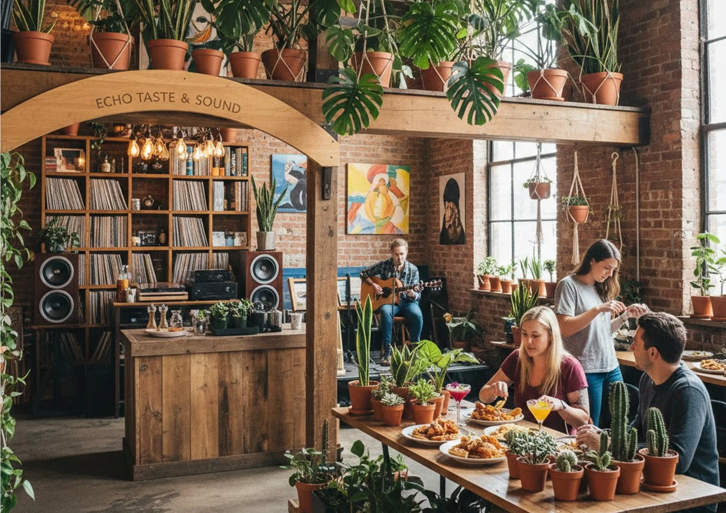 Echo Taste & Sound operates as a community-based restaurant and live music venue that supports local artists and musicians. Artwork rotates regularly and is available for purchase, vinyl is curated thoughtfully, and the plant selection evolves seasonally.