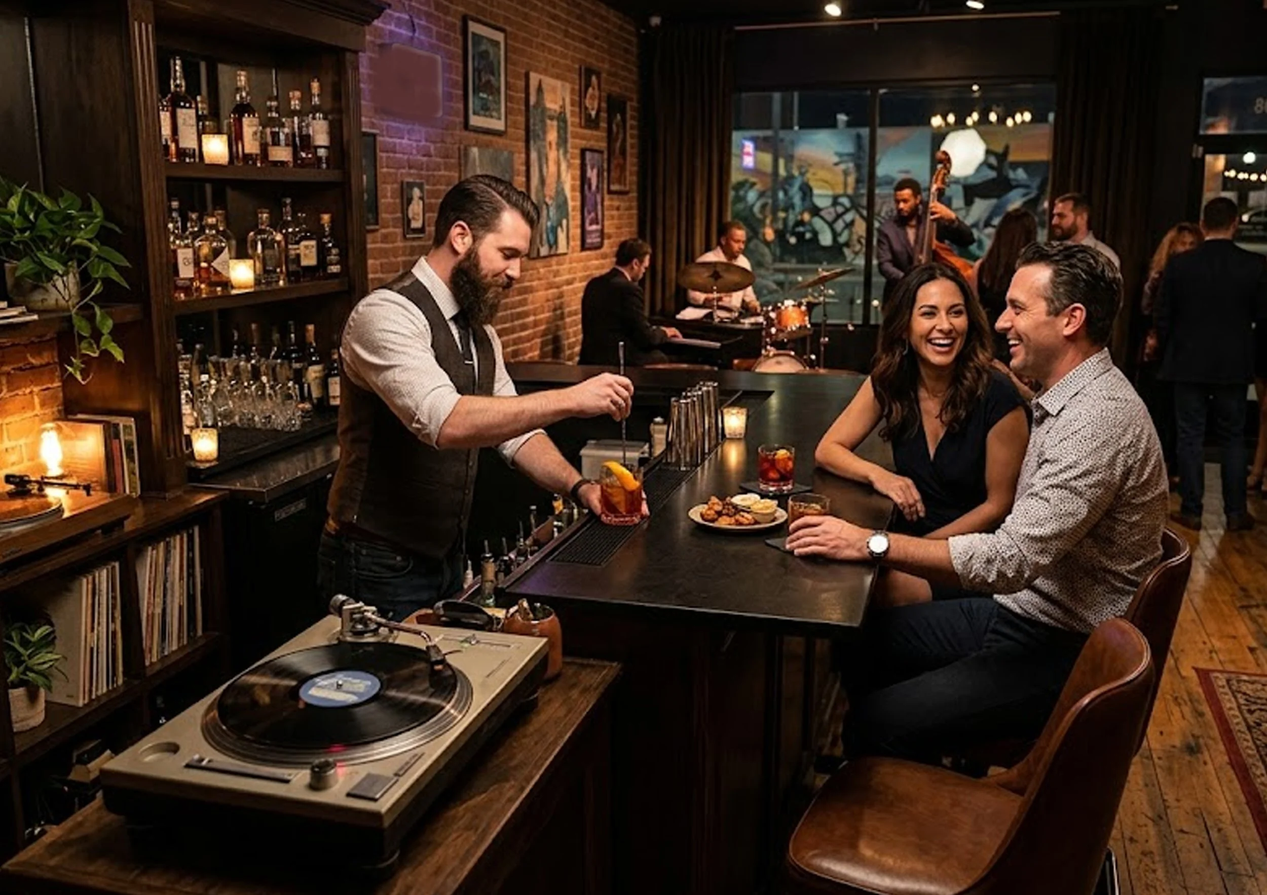 The goal is immersion. You step inside and feel transported — whether through vintage design elements, vinyl spinning softly in the background, or a bartender who treats every Old Fashioned as a craft.