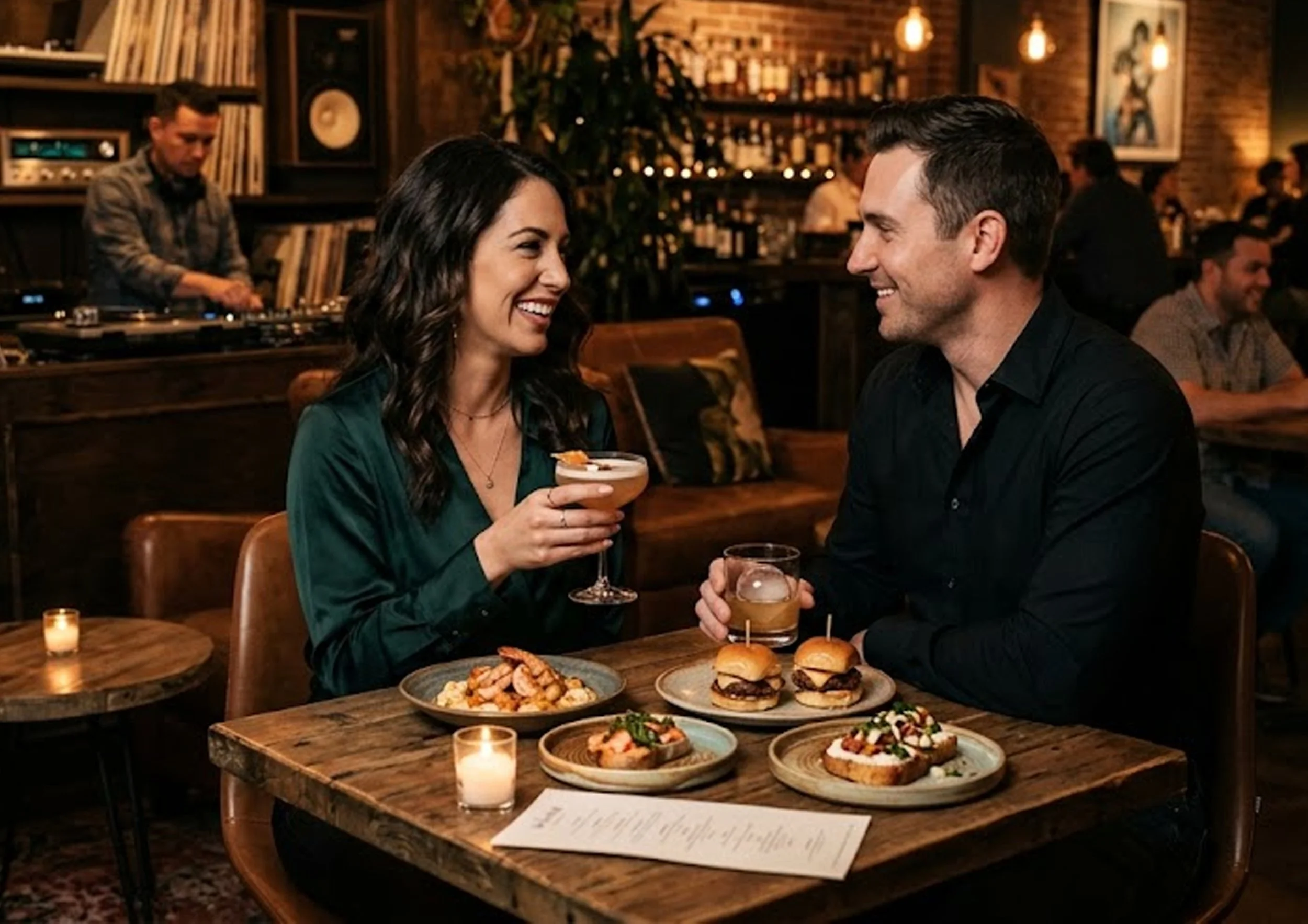 You might begin with classic cocktails and small plates as vinyl sets the mood. As live musicians or DJs take the stage, the atmosphere deepens into a shared sensory experience. Between sets, couples often explore the art displays or browse vinyl, turning a simple evening out into something memorable and personal.