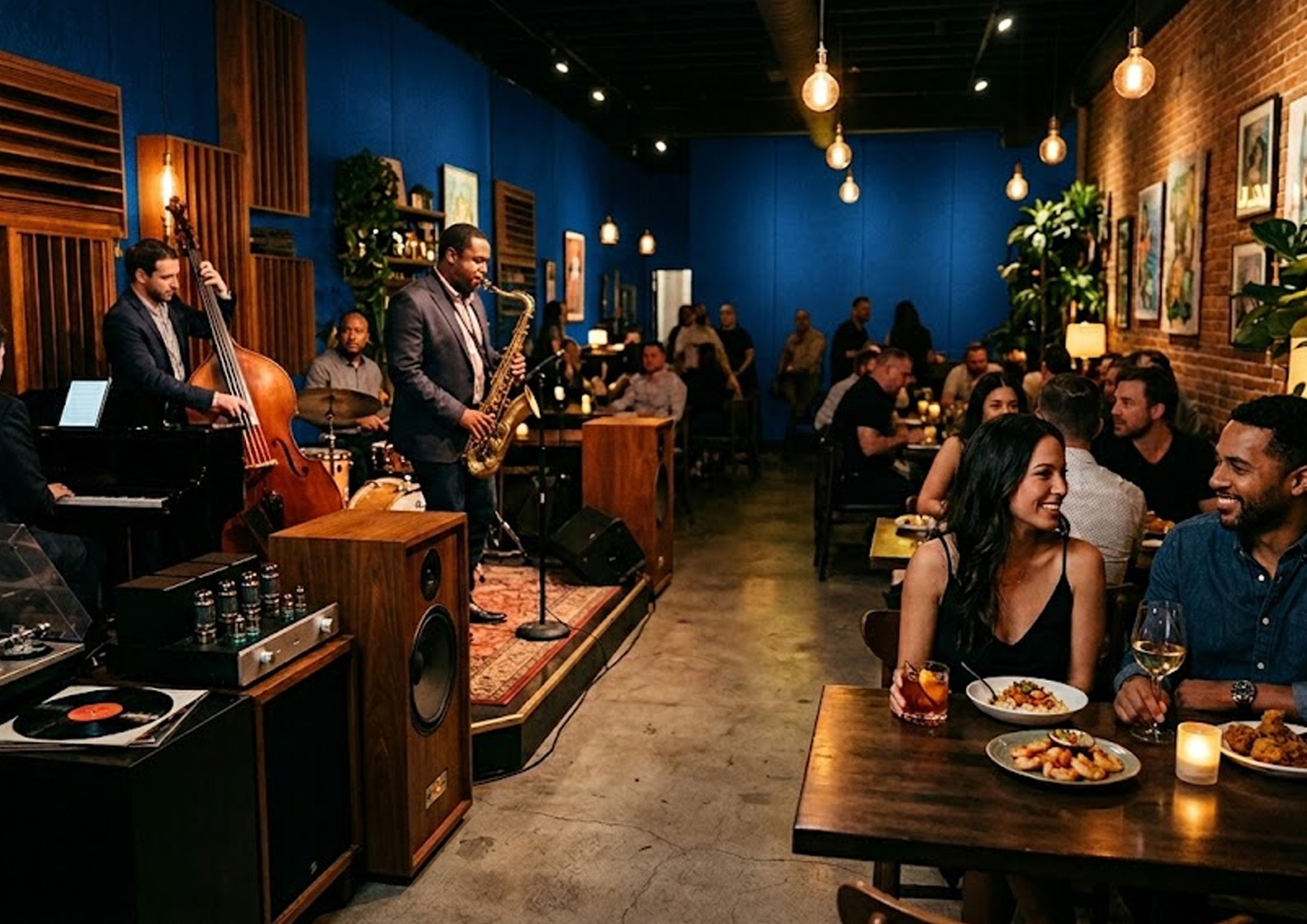 The premium sound system delivers warmth, clarity, and balance, allowing guests to hear every instrument and vocal nuance. Whether it is live jazz, soulful blues, funk-inspired grooves, or curated vinyl DJ sets, the sound fills the room without overwhelming conversation.