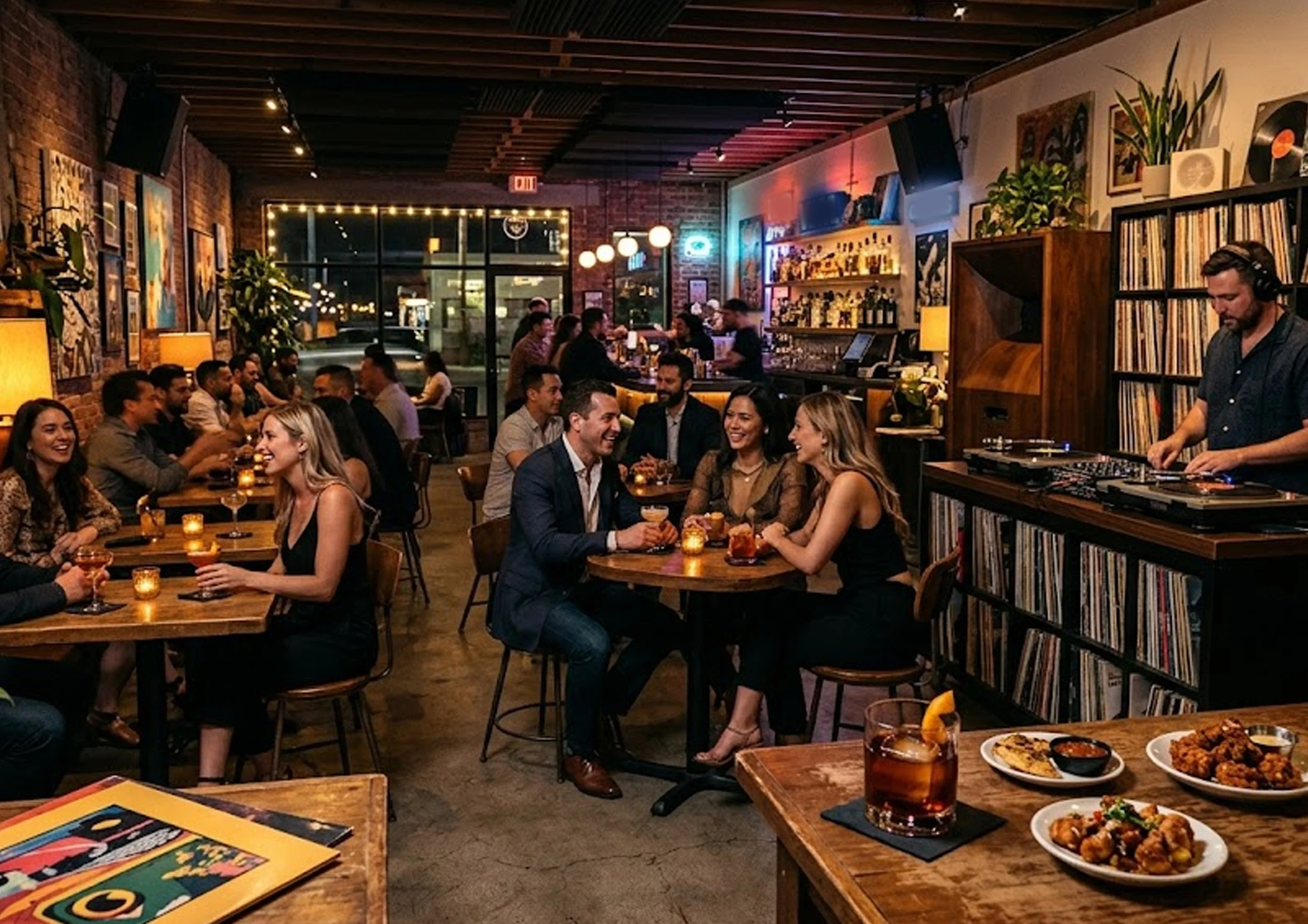 You might begin the evening with small plates and classic cocktails while vinyl spins softly in the background. As the night progresses, live DJs or musicians elevate the energy without overwhelming the atmosphere. Guests often browse art or records between sets, making the experience interactive and memorable.