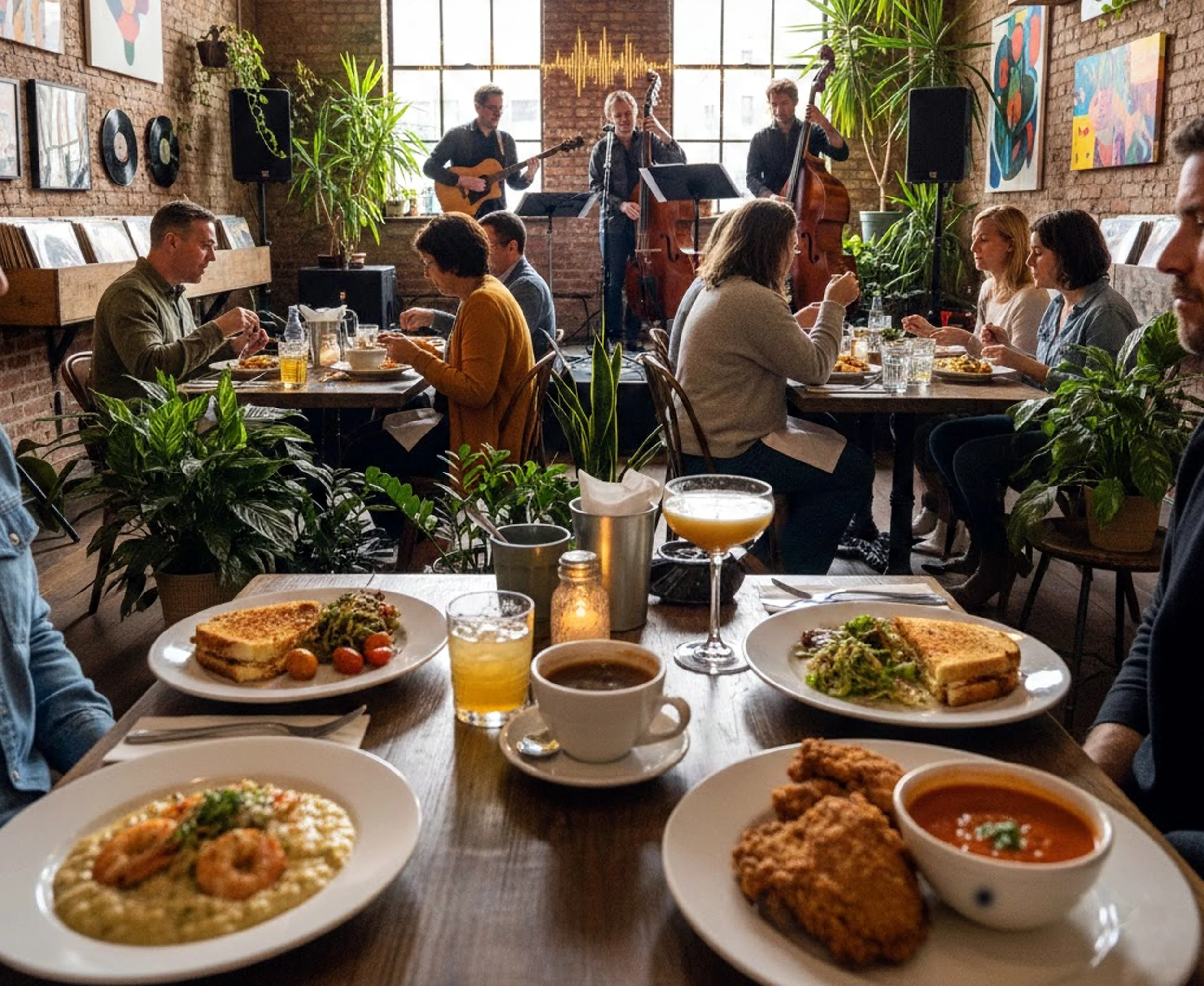 We curate a mix of high-fidelity vinyl playback and live performances. Expect soulful genres like jazz, blues, funk, and soul that enhance the dining experience rather than overpowering it.