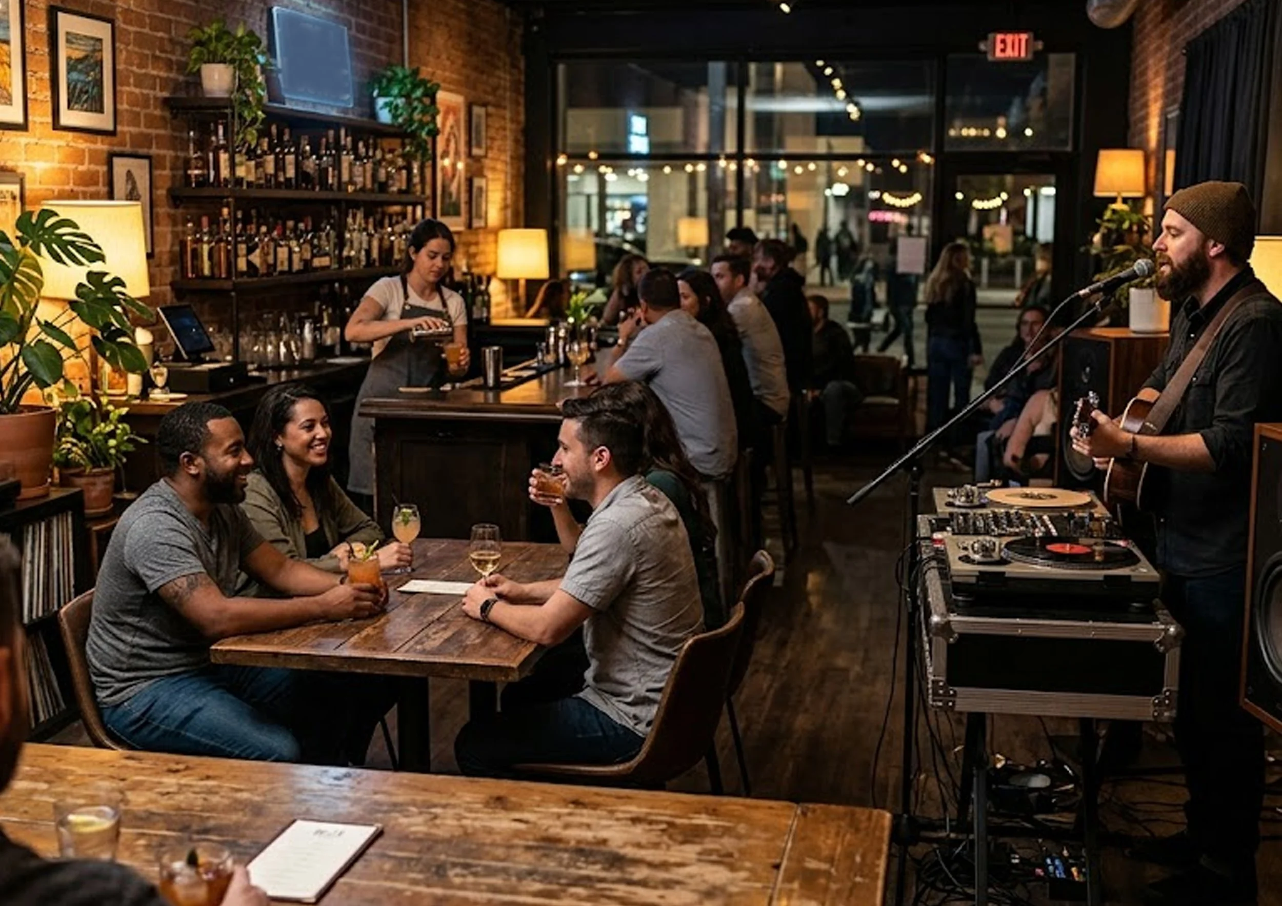 Guests can start with a handcrafted cocktail or a chef-driven dish, then settle in as vinyl records and live performances create a rich sensory experience. Many visitors take time to explore the art displays, browse the vinyl collection, or select a plant to bring home—making each visit both engaging and memorable.